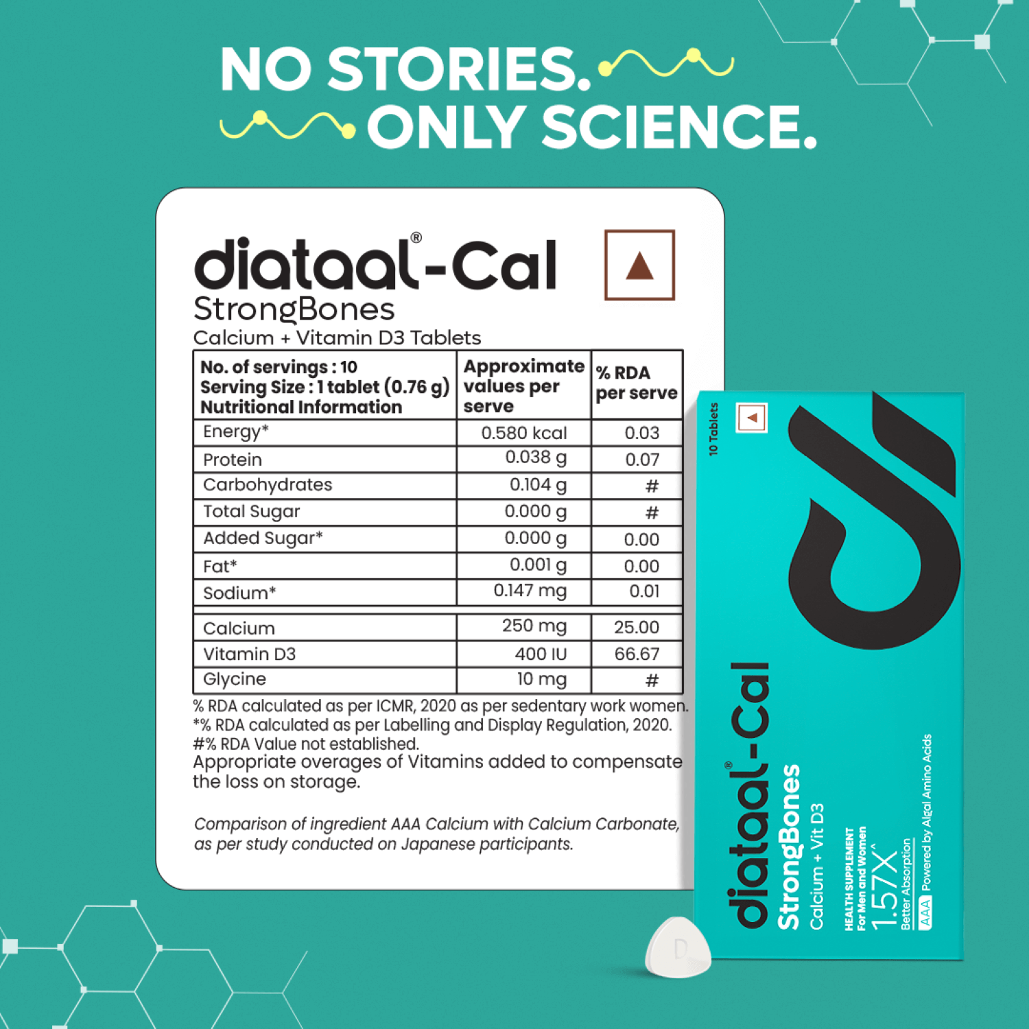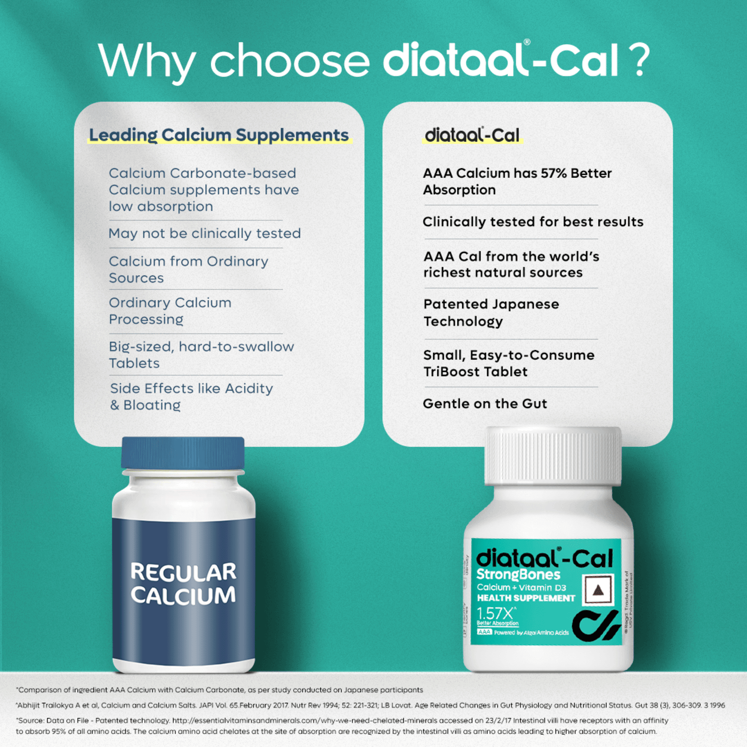 Diataal Cal contains Active Absorbable Calcium which is produced using a Japanese-patented process that utilises calcium from the world’s richest sources. It is then pre-treated with algal amino acids. They have high absorption in the body. Thus providing you with a calcium supplement that is absorbed faster, with enhanced efficiency and ease.